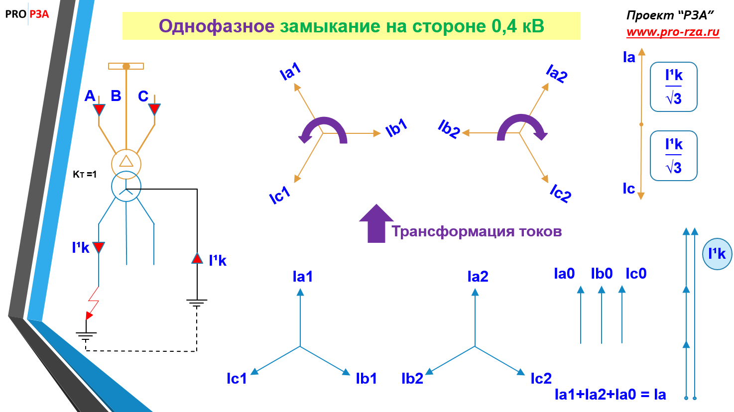 Есть трансформатор 10/0,4 кВ, т.е. его коэффициент трансформации - 25. На стороне 0,4 кВ происходит однофазное короткое замыкание с током 25 кА. Какой ток КЗ будет протекать на стороне 10 кВ?